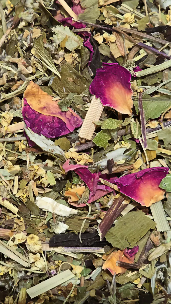Afternoon Bliss is a smooth, aromatic infusion crafted to bring ease, clarity, and calm as the day winds down. Eyebright and Elderflower are traditionally used to support a sense of lightness, while Lemon Balm and Spearmint offer naturally soothing, refreshing qualities. Lemongrass and Linden provide gentle, comforting softness, and Mugwort has long been associated with clarity and reflective focus. Rose and Calendula bring emotional warmth; Ginkgo is traditionally used to support healthy circulation; and Pai Mu Tan (White Peony Tea) adds a delicate depth and a soft, balancing presence.