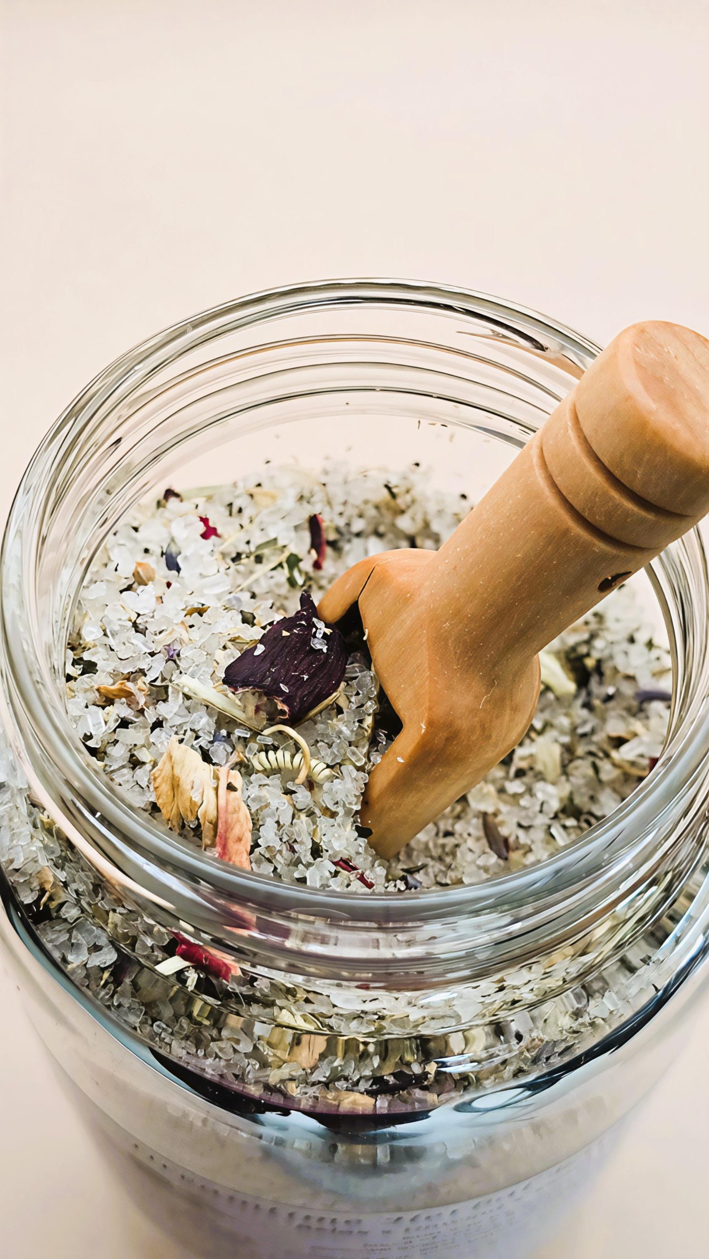 Each jar includes a wooden spoon for mindful measuring and a reusable cotton bag, so you can steep the herbs gently or sprinkle them directly into your bath.