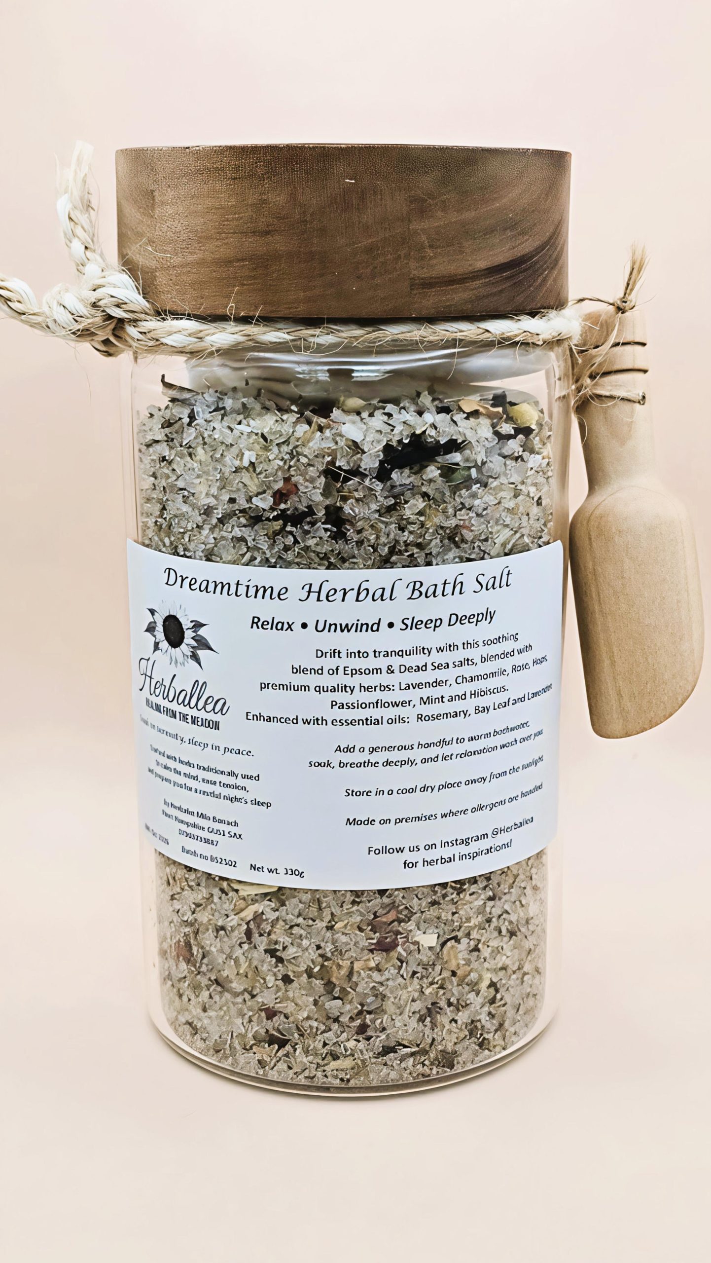 Create a moment of calm at the end of your day with Dreamtime Botanical Bath Salt Ritual, a premium herbal blend handcrafted in the UK by Herballea Healing from the Meadow.