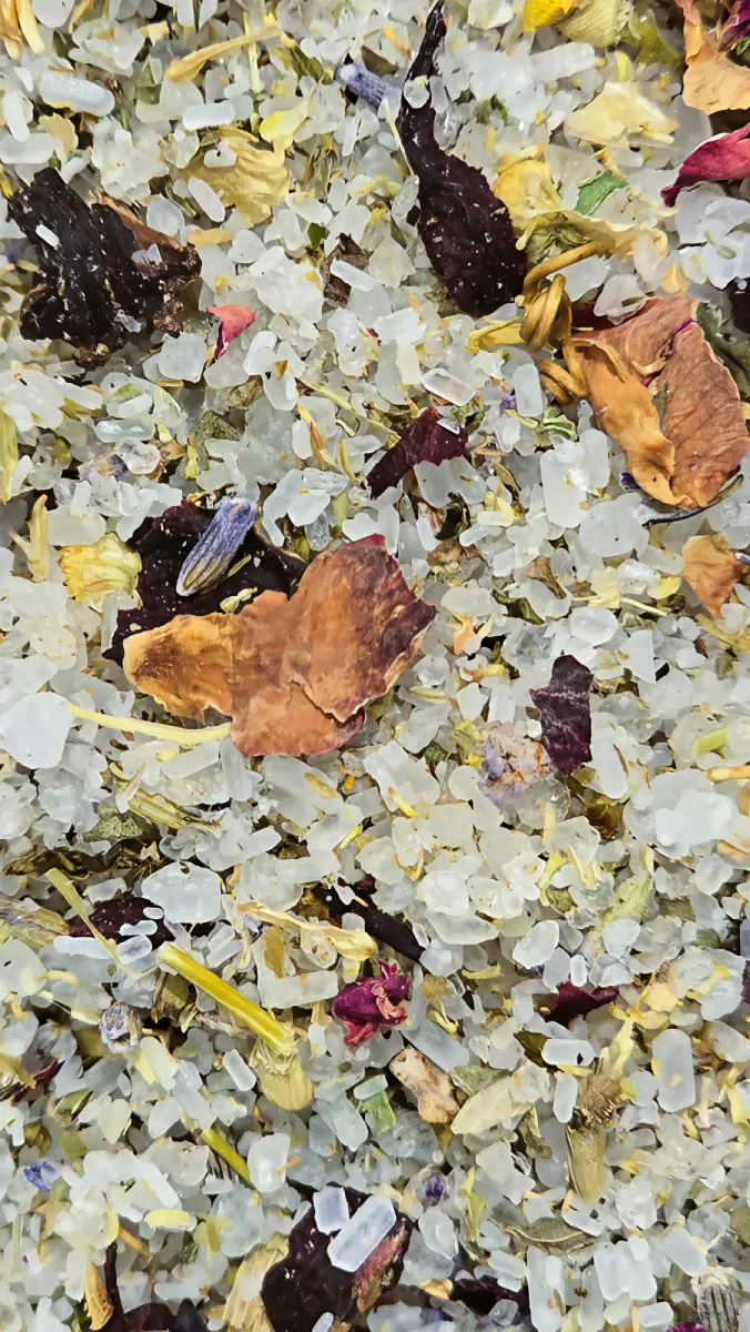 Epsom Salt, Dead Sea Salt, Lavender (Lavandula angustifolia), Chamomile (Matricaria chamomilla), Rose (Rosa spp.), Hops (Humulus lupulus), Passionflower (Passiflora incarnata), Mint (Mentha spp.), Hibiscus (Hibiscus sabdariffa), Rosemary Essential Oil (Rosmarinus officinalis), Lavender Essential Oil (Lavandula angustifolia), Bay Leaf Essential Oil (Laurus nobilis).