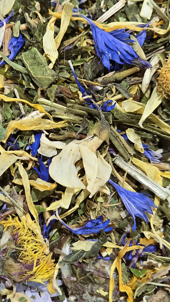 Morning Bliss is a refreshing herbal blend created to bring lightness, clarity, and a gentle sense of renewal to the start of your day. Cleavers, Calendula, and Goldenrod are traditionally used to support natural cleansing and a feeling of flow, while Nettle and Sencha offer mineral-rich nourishment and a soft, steady lift. Coltsfoot and Hyssop are long associated with maintaining clear, open breathing, and Holy Basil is valued for promoting calm focus. Cornflower and Black Locust add a subtle floral note, evoking warmth, freshness, and new beginnings.